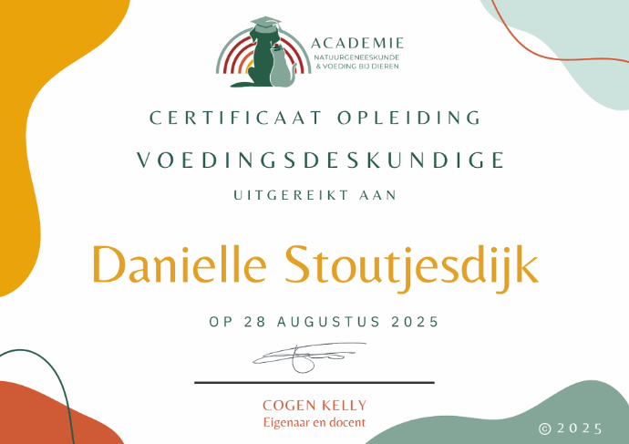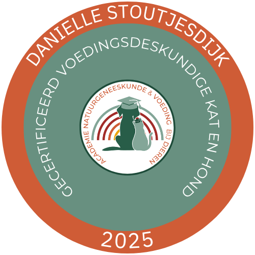 Ik ben Danielle Stoutjesdijk, voedingsdeskundige voor hond en kat, en ik help jou om door de bomen het bos weer te zien. Geen hypes of standaardlijstjes; maar eerlijk, praktisch en persoonlijk advies dat past bij jouw dier én jullie leven. Of je nu brok voert of vers, een pup hebt of een senior, samen kijken we wat jouw dier nodig heeft om weer te floreren.